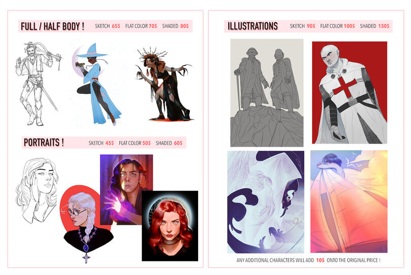 1. Original prices are going to change according to the complexity, difficulty, and size of each individual piece.2. Clear visual references and or descriptions of the commission idea must be provided by the client along with a first estimate of cost by the artist.3. All payments are through Paypal invoices and in USD only. After confirming the details of the commission, a PayPal invoice will be sent to the client to pay.4. Payments under $50 must be paid upfront in full before work begins.5. Payments over 50$ can be paid in two payments if the client chooses to do so. 50% upfront once an agreement is made upon commission and the other 50% when the commission is completed.6. Any artwork is not permitted to be used in training for AI/ML models.7. The price of the artwork may vary if it is for commercial use vs a private commission.8. If the artwork is finished before final payments are made, the client will not obtain the original commission or un-watermarked image of the commission until final payments are received.9. Clients will have the chance to give changes to their commission in the sketch or thumbnail stage. I will present draft thumbnail sketches that the client may choose from before I begin to refine the chosen composition. No more than three revisions are given unless the client wishes to pay extra for new thumbnails.10. I will not accept/do not give permission to have my artwork used in any form of cryptocurrency or nonfungible tokens.11. The artist reserves the right to reject critique to artistic skill or style preference (i.e. anatomy, style, etc) if said critique reduces the artistic quality of the piece.12. If the client wishes to cancel their commission during the sketch stage they will be refunded 50% of what they paid.13. If the client wishes to cancel their commission during or after the coloring stage they will not get a refund.14. The artist will not discuss a commission with a client via public social media, instant messenger, or private notes. All communications must be made through ([email protected]) to ensure that all information and communications are in one location.15. The artist reserves the right to issue and or cancel a commission at any time.16. The artist ensures that the client will receive email updates on the commission when necessary. Clients are encouraged to check-in when they feel it’s necessary for updates or reminders.17. The artist will not depict illegal activities, sexually explicit (x-rated) materials, body horror, or hateful images.18. The client retains all rights to their respective characters, but this does not allow them their rights to the commissioned image.19. The client may not profit from the artwork (sale of digital files or rights to the image).20. The client cannot alter the artwork itself. The client may upload the artwork to their personal website or gallery, but credit to the artist is required, the image must not be in any high resolution or unwatermarked version of the artwork.21. The artist may recycle sketches and preparatory works that were rejected by clients for other commissioners or personal works.22. The client must read, understand, and agree to all the above terms before entering an agreement with the artist. By sending a payment, the client agrees to the terms above.